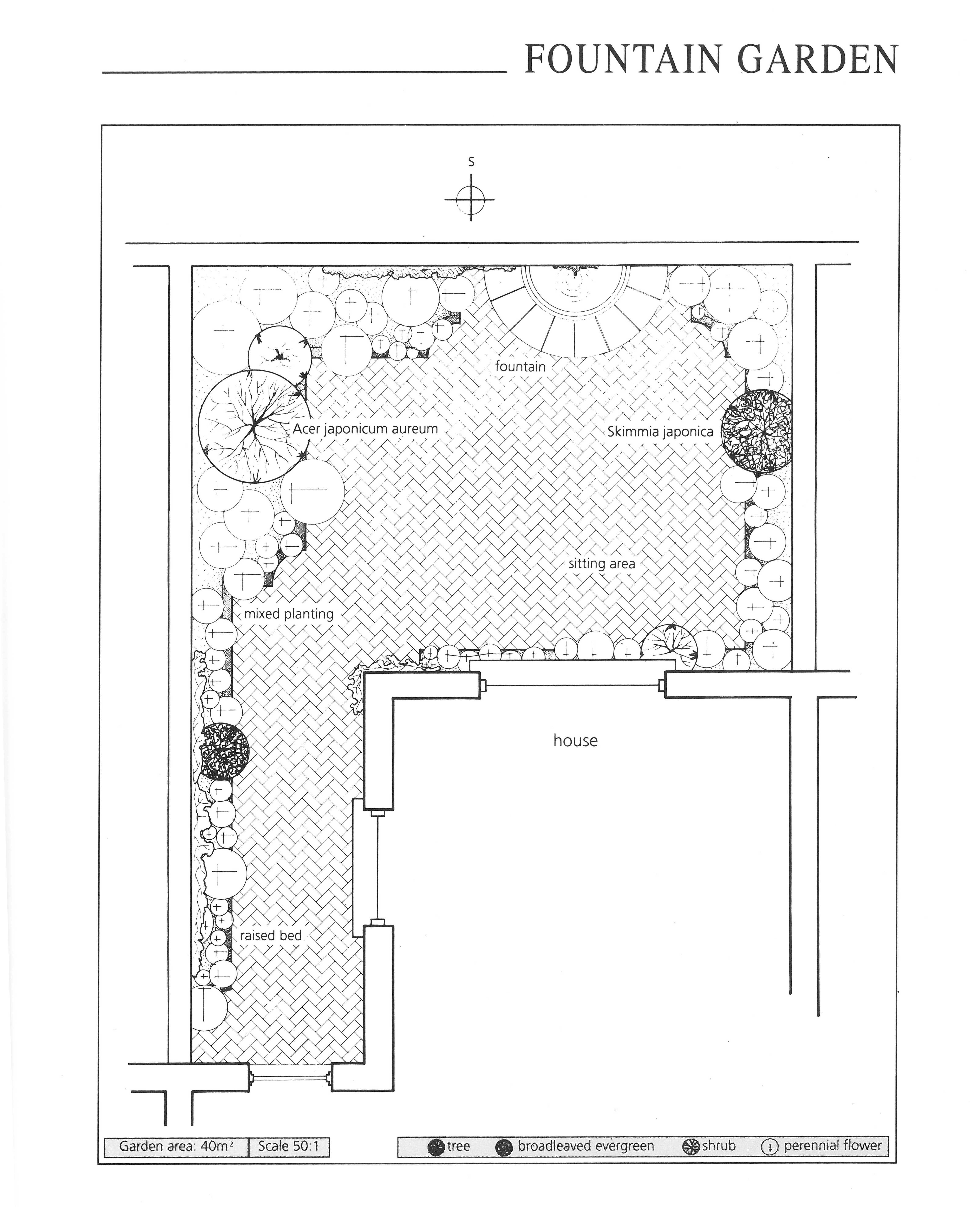 A formal style with the use of formal circles in the border edges and the water feature. The basin fountain cannot be seen until the corner is turned. Because of their small size, paving bricks create an impression of greater space, as does the herringbone pattern.