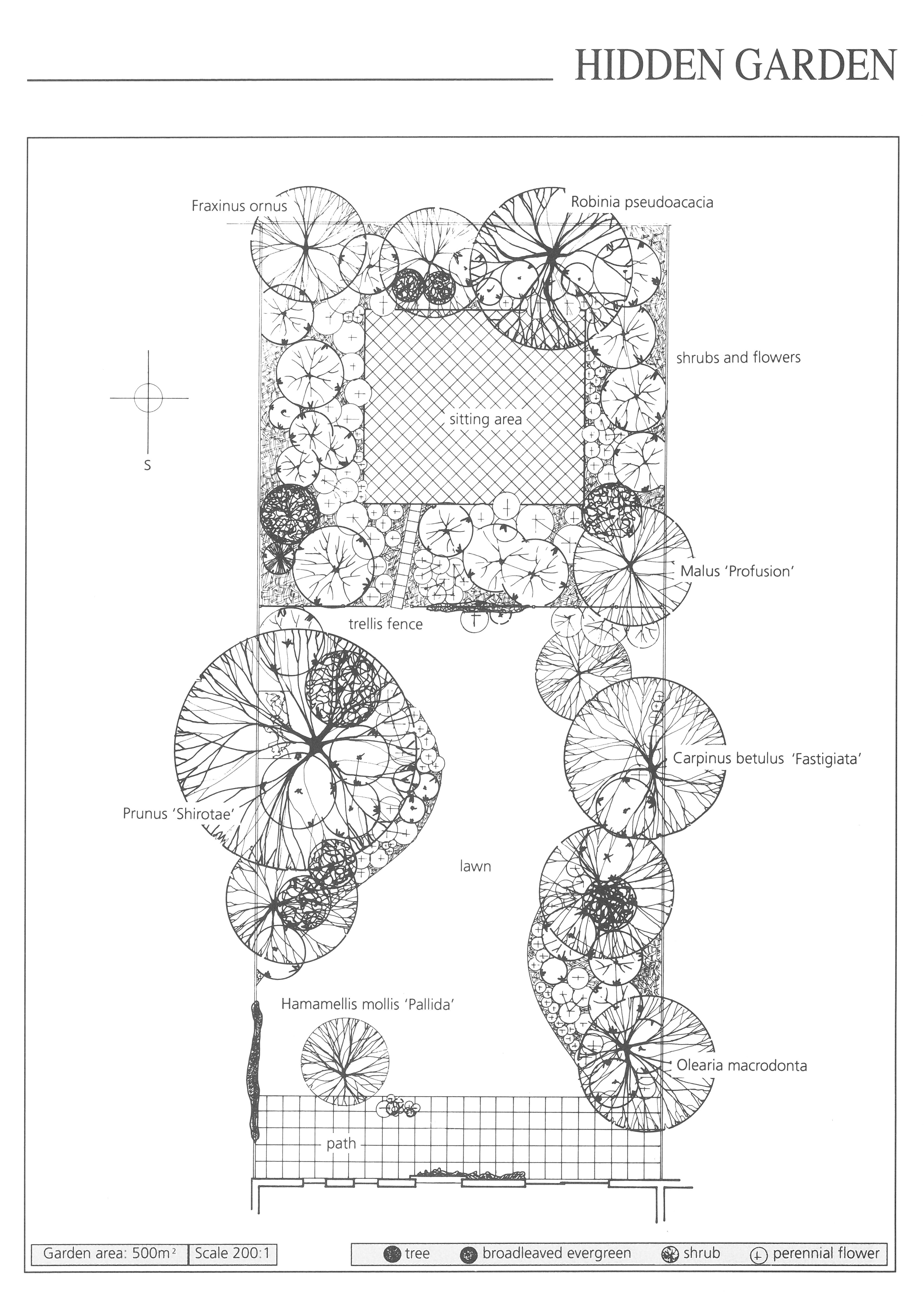 An informal style with formal touches such as the trellis and the diamond pattern square paved area. There is a formal feel to the hidden garden, set within an informal structure. The borders in the hidden garden could be raised about ten centimetres, if desired.