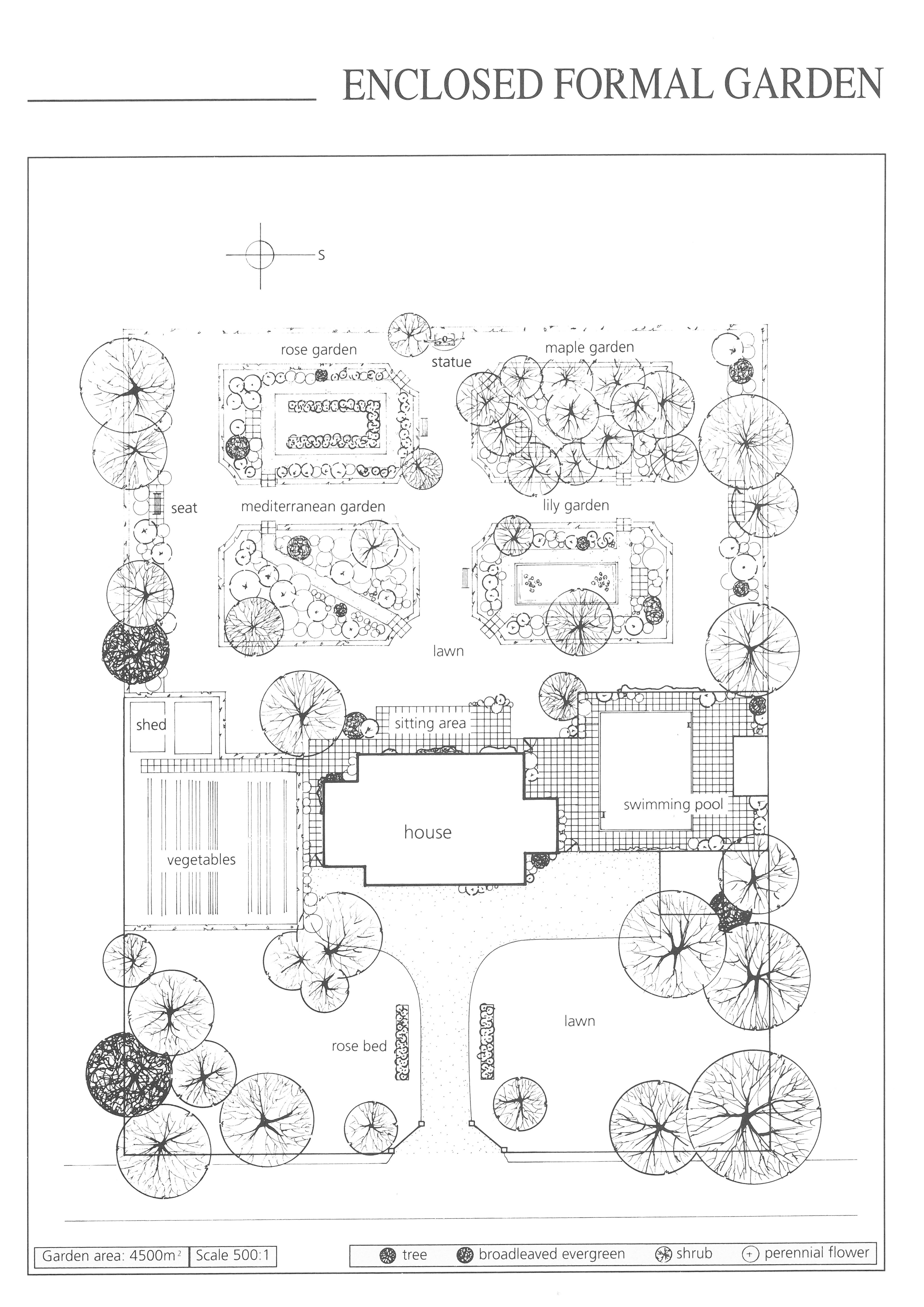 A few large trees decorate the front lawn area. A mixture of small shrubs and perennial flowers spread onto the paving, and with the climbers on the walls, help to link the walled area and house to the garden. Trees, shrubs and some perennial flowers fill the straight borders. Each of the enclosed gardens features its theme plants and some complementary trees, shrubs and perennial flowers.