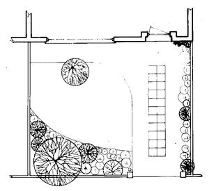 Some beds of various sizes have been made by not paving out to the boundary. A flight of two (10 cm) steps has been made with the same paving slabs to provide access to the terrace area. A curved bed at the back of the terrace provides space for plants. Lighting would highlight the paved area at night, in particular the steps.