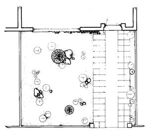 A straight drive approaches the house directly and divides the front garden almost evenly. High walls (2.5 m) and hedges divide the front from the back garden. The back garden has a central axis leading from a raised terrace paved with 60 cm square concrete slabs, passing between formal borders, to a formal lily pond and loggia in a partially enclosed garden.