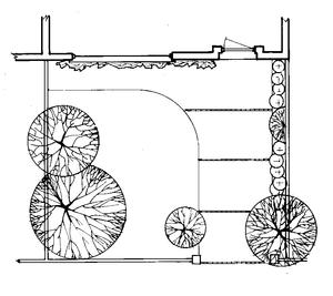 A long narrow front garden might be divided as shown to provide a parking area at a distance from the house, thus giving the house the benefit of the ornamental end of the garden. The division might be simply created by borders that swing out in a curve into the central area, or more definitely by a fence or wall. The farthest part of the garden away from the house might be planted up with trees and shrubs and given an occasional tidy up.