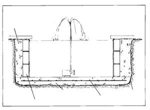 Dig a hole to the size and shape required. The depth should be 45 centimetres for a small pool, 60–75 centimetres for a large one. A ‘shelf’ to one side, about 20 centimetres deep, is ideal for marginal water plants. The sheet to fit the hole should be the maximum length plus twice the maximum depth, and the maximum width plus twice the maximum depth. Line the hole with a layer of sand; spread the liner; weigh down the edges with bricks or stones, and fill the pool with water.