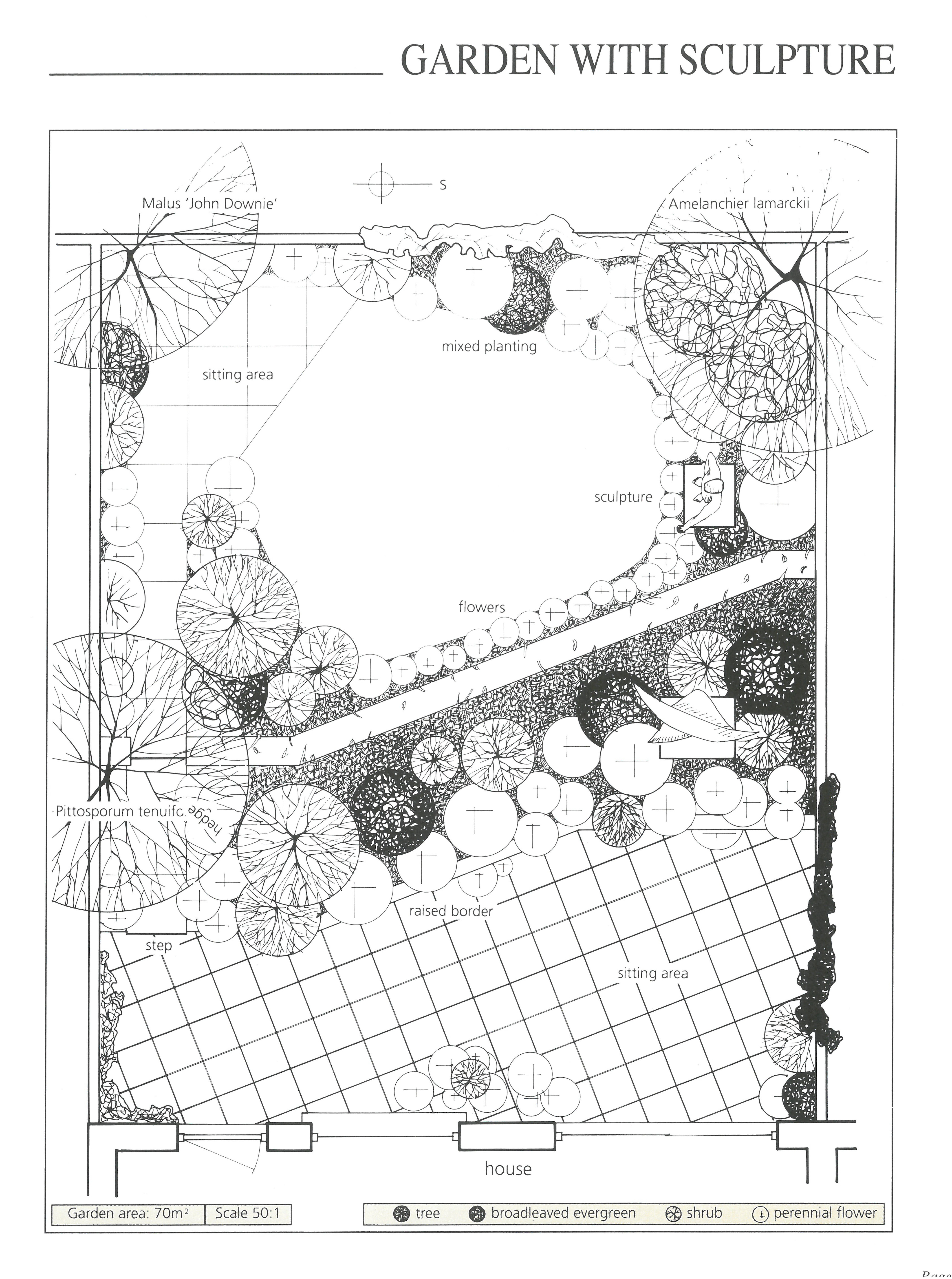 A formal symmetrical style with matching rectangular patterns in the paved area, paths and borders, setting off the informality of plants. The colour and shape of the plants, especially the uneven sized trees break the symmetry. The sculpture emphasises the symmetry. The lawn platform could alternatively be lower than the paved area, making a sunken lawn.