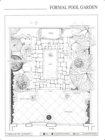 Two columnar trees emphasise the lines of the pool, loggia and straight borders. Two others, on clean stems, have rounded crowns to contrast. The borders have a mixture of small shrubs, perennial flowers and a lot of bulbs for year-round interest. The pots on the paved area have colourful annuals and a few more permanent plants. Climbers decorate the walls and make use of the vertical space.