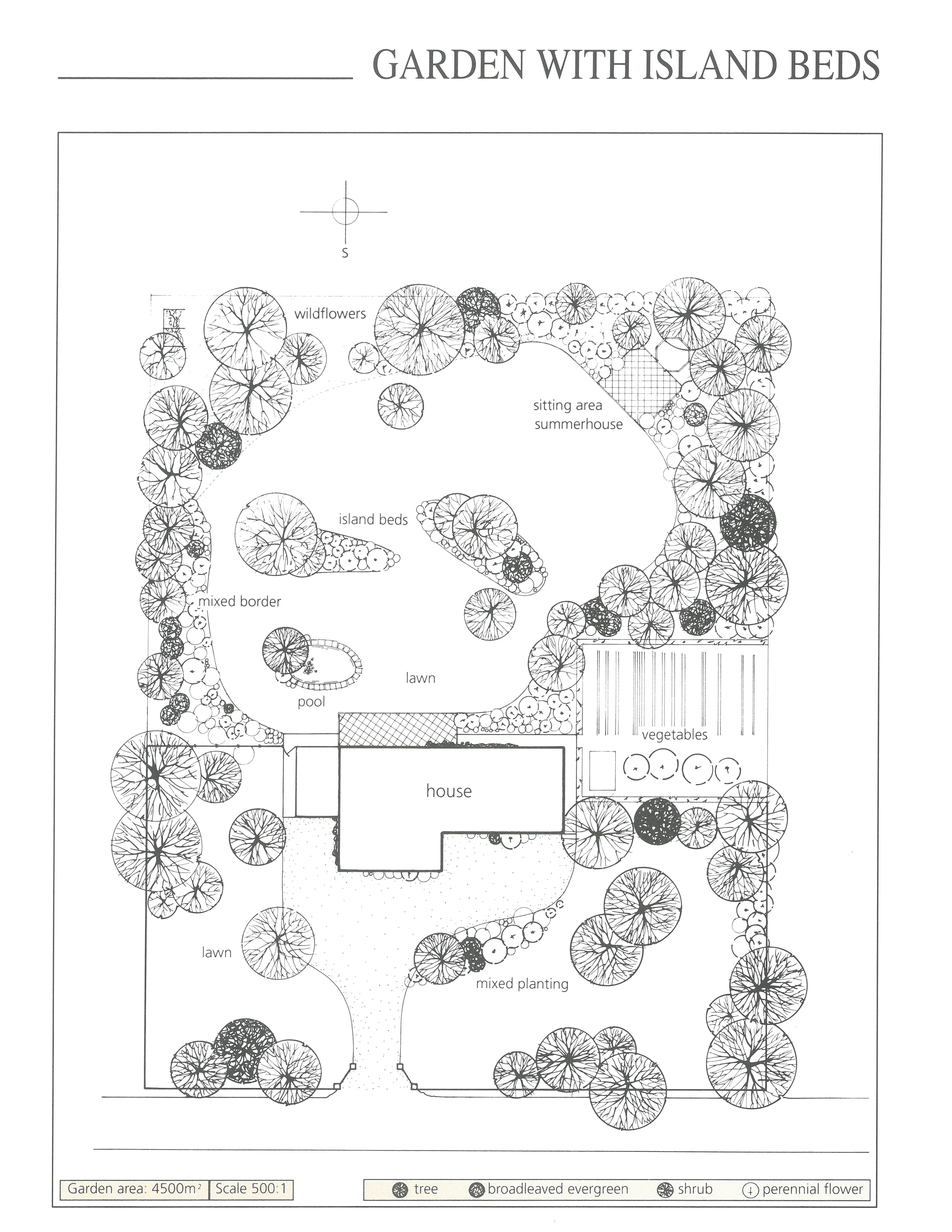 A very informal style suitable for growing a wide range of plants especially shrubs. The pool divides the garden informally, as do the curves of the island. Views down the grass alleyways lend interest and encourage the curious to explore.