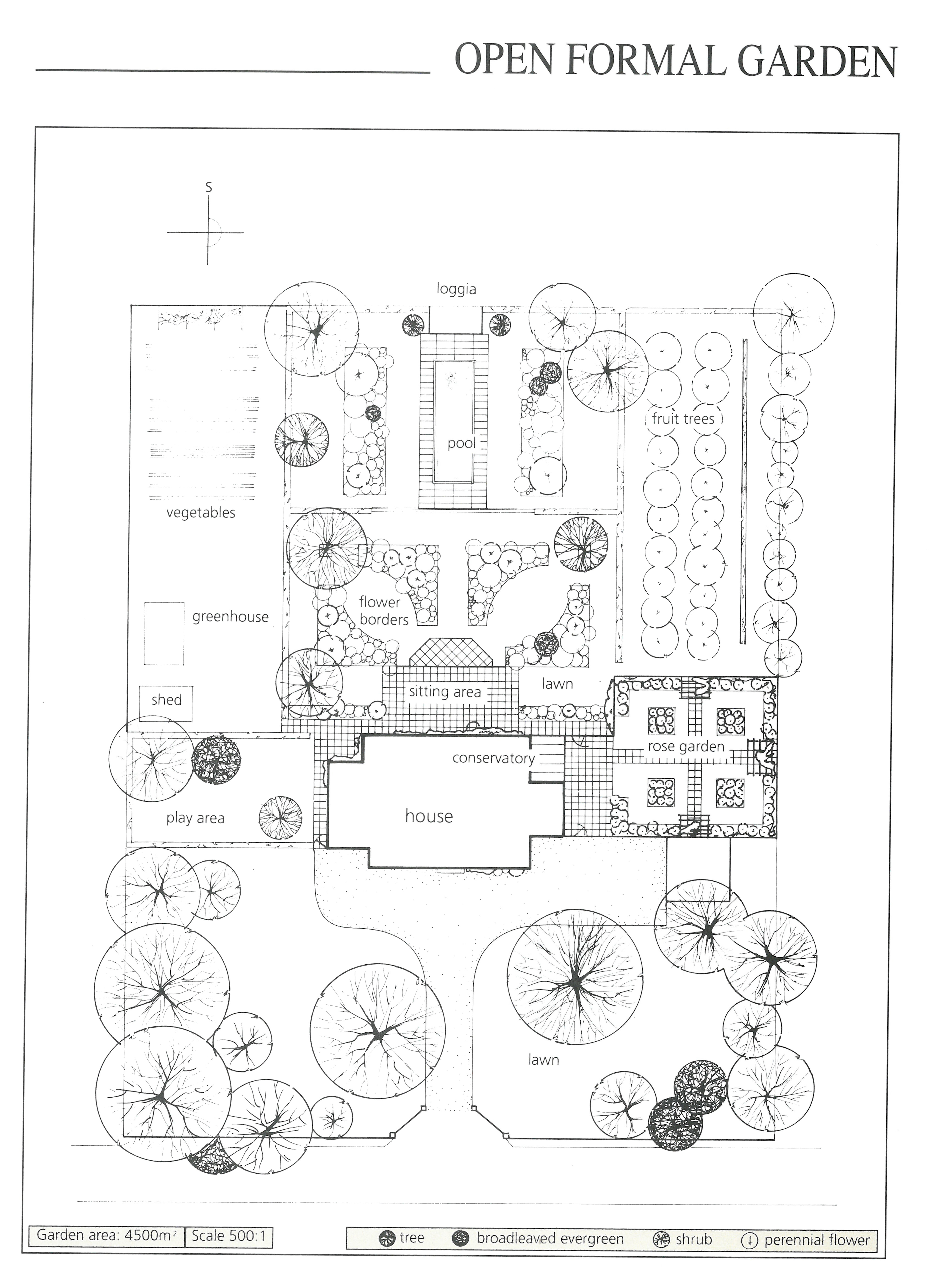 A simple, informal style with the kitchen garden divided away from the rest. Borders and beds are used to break the straight lines of boundaries and hedges.