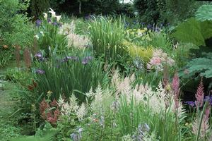 Smooth lawn or paving emphasises the flat stillness of water; blue flowers pick up its reflected sky-colour. Subtle repetition creates a rhythm that relaxes the eye and hold the design together.